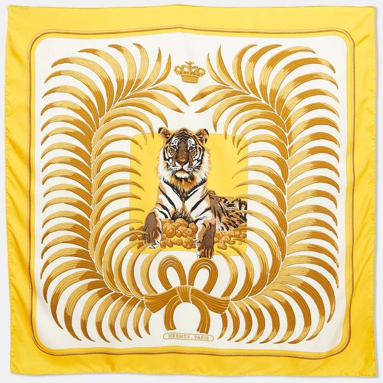 Pre Owned Hermès White/Gold Tiger Royal Print Silk Square Scarf