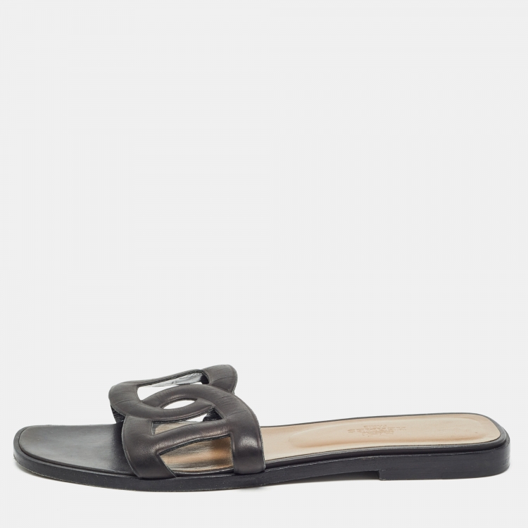 Hermes Black Leather Aloha Flat Sandals Size 39