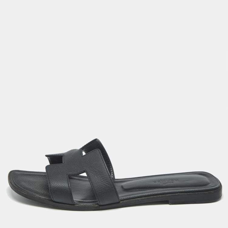 Pre Owned Hermes Black Leather Oran Flat Slide Sandals Size 38