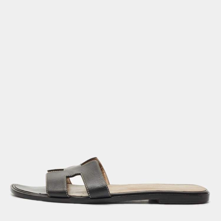 Pre Owned Hermes Black Leather Oran Flat Slides Size 40