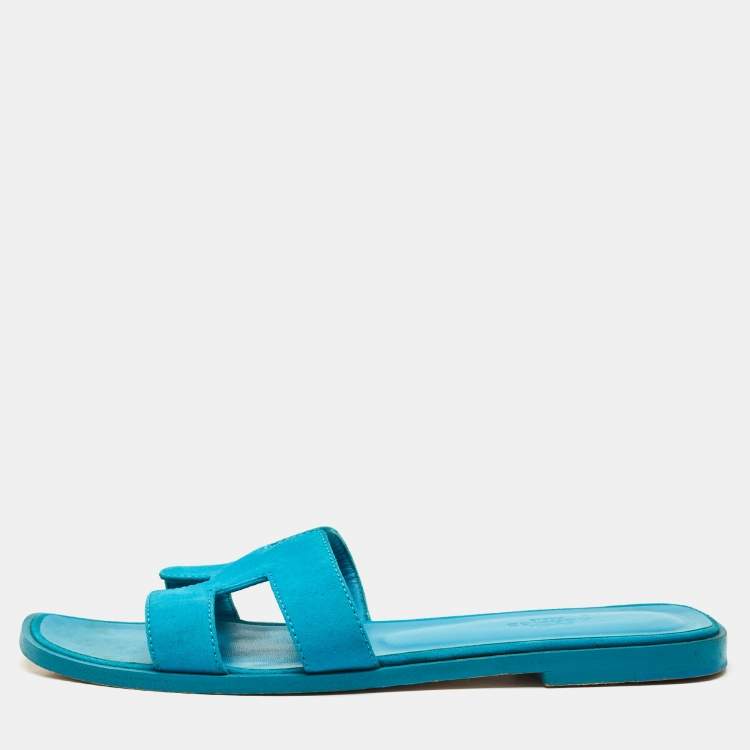 Pre Owned Hermes Blue Suede Oran Flat Slides Size 38