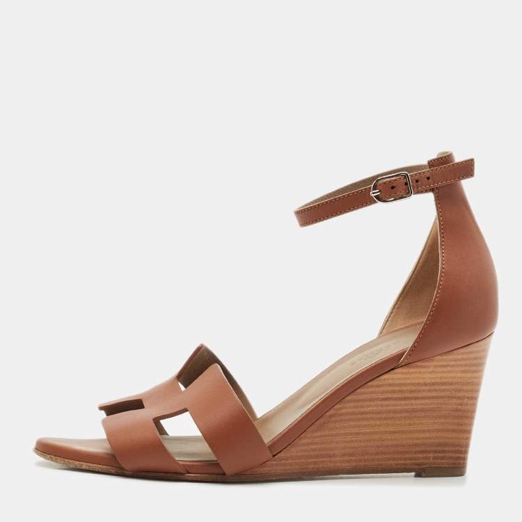 Hermes Brown Leather Legend Ankle Strap Wedge Sandals Size 39