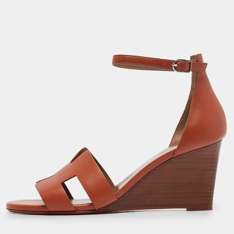 Hermes Brown Leather Legend Wedge Sandals Size 38.5