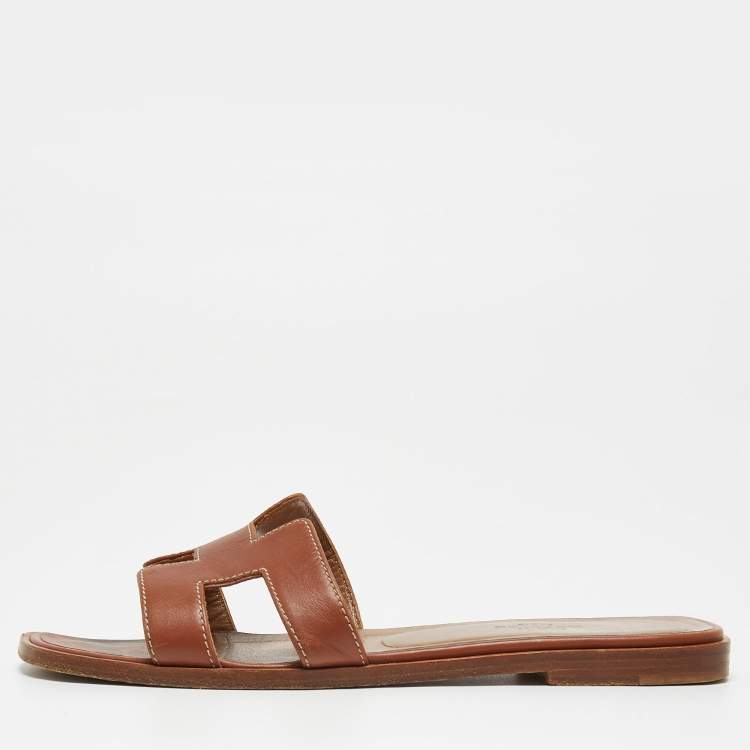 Pre Owned Hermes Brown Leather Oran Slides Size 36