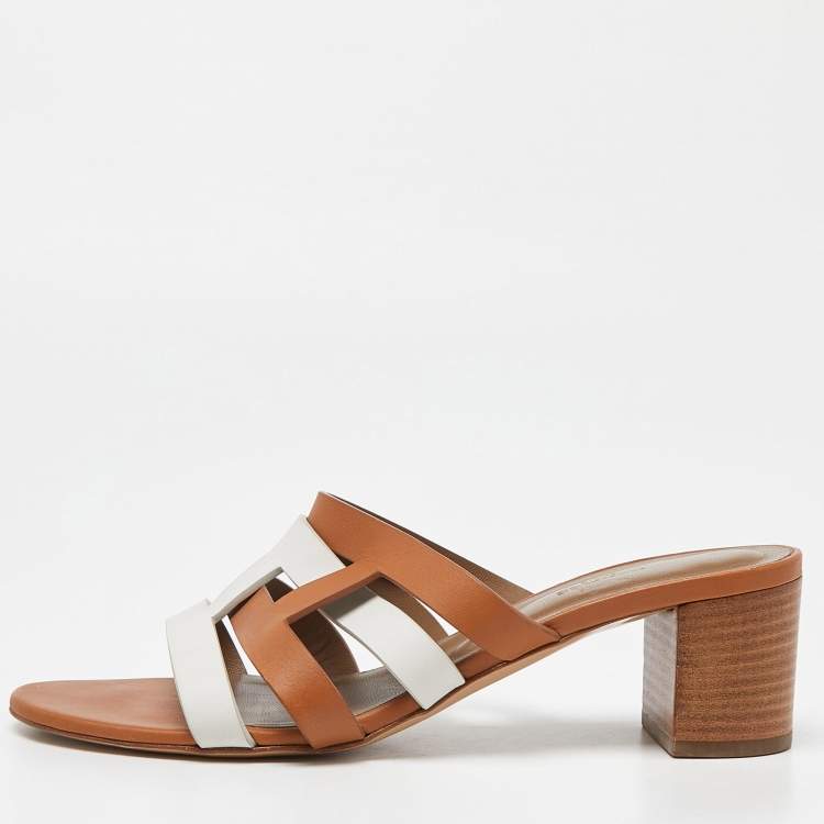 Hermes Brown/White Leather Amica Slide Sandals Size 40