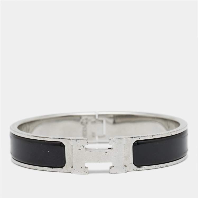 Pre Owned Hermes Clic H Black Enamel Palladium Plated Bracelet