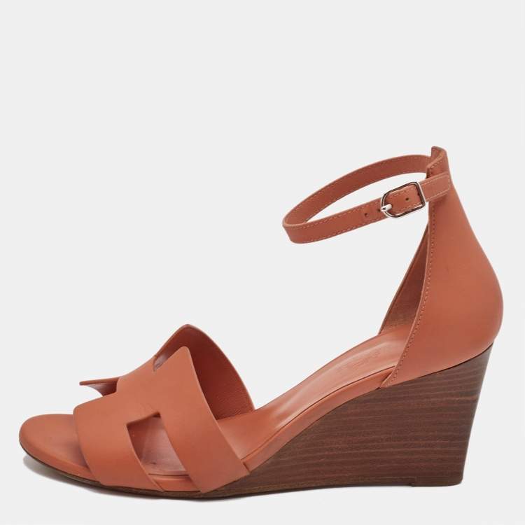 Pre Owned Hermes Orange Leather Legend Wedge Sandals Size 38.5
