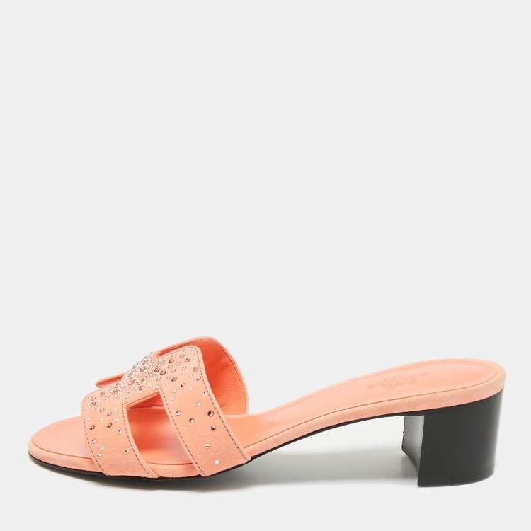 Pre Owned Hermes Orange Suede Crystal Embellished Oasis Slide Sandals Size 37