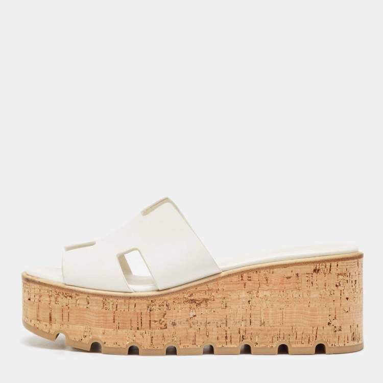 Pre Owned Hermes White Leather Eze Cork Platform Wedge Sandals Size 39