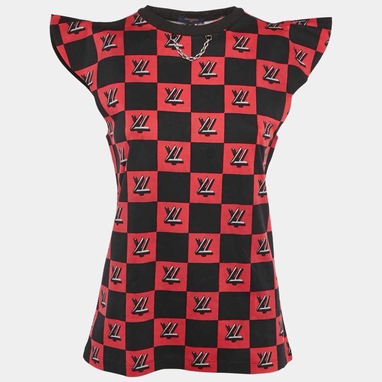 Louis Vuitton Black/Red Logo Checkered Jersey Cap Sleeve Top M