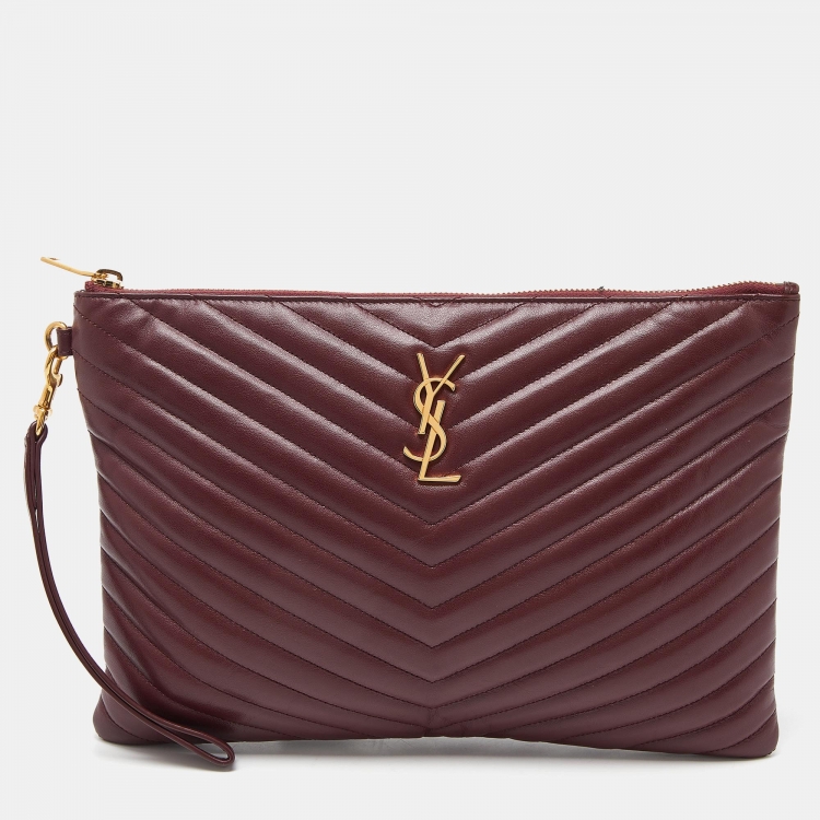 Pre Owned Saint Laurent Burgundy Matelassé Leather Monogram Wristlet Pouch