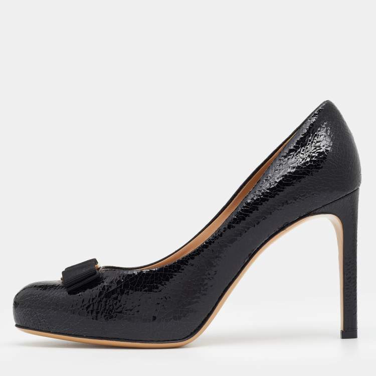 Salvatore Ferragamo Black Crinkled Leather Vara Bow Pumps Size 39