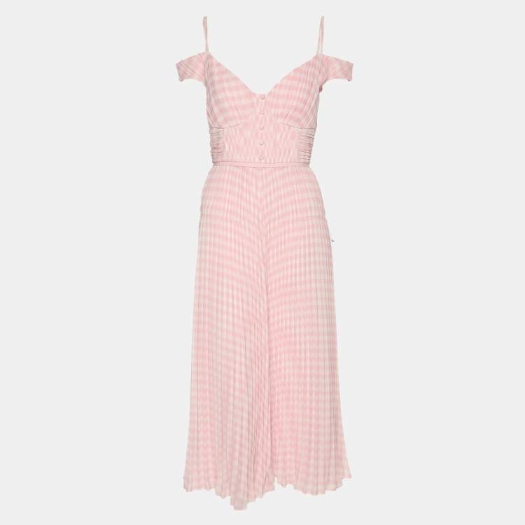 Pre Owned Self-Portrait Pink Gingham Print Chiffon Pleated Midi Dress M