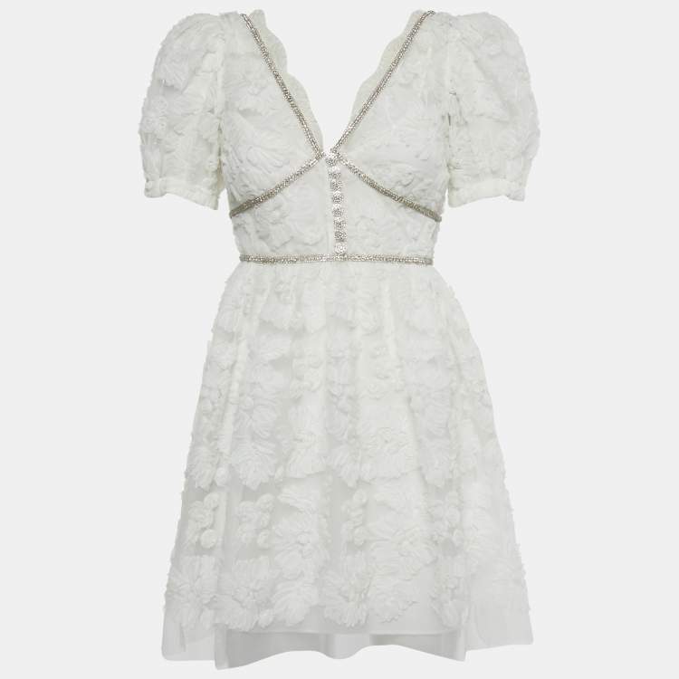 Self-Portrait White Crystal Embellished Ribbon Lace Mini Dress XS