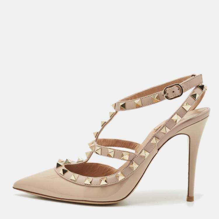 Pre Owned Valentino Beige Patent Leather Rockstud Ankle Strap Pumps Size 36.5