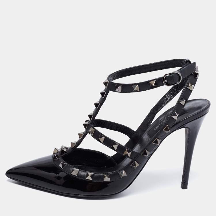 Pre Owned Valentino Black Patent and Leather Rockstud Ankle Strap Pumps Size 38.5