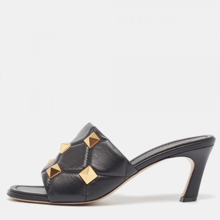Pre Owned Valentino Black Quilted Leather Roman Stud Slide Sandals Size 40