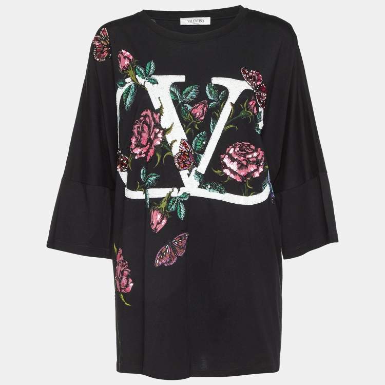 Valentino Black V Logo Embellished Cotton Ruched Waist T-Shirt M