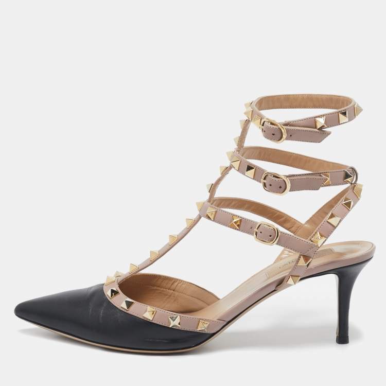 Pre Owned Valentino Black/Beige Leather Rockstud Ankle Strap Pumps Size 40
