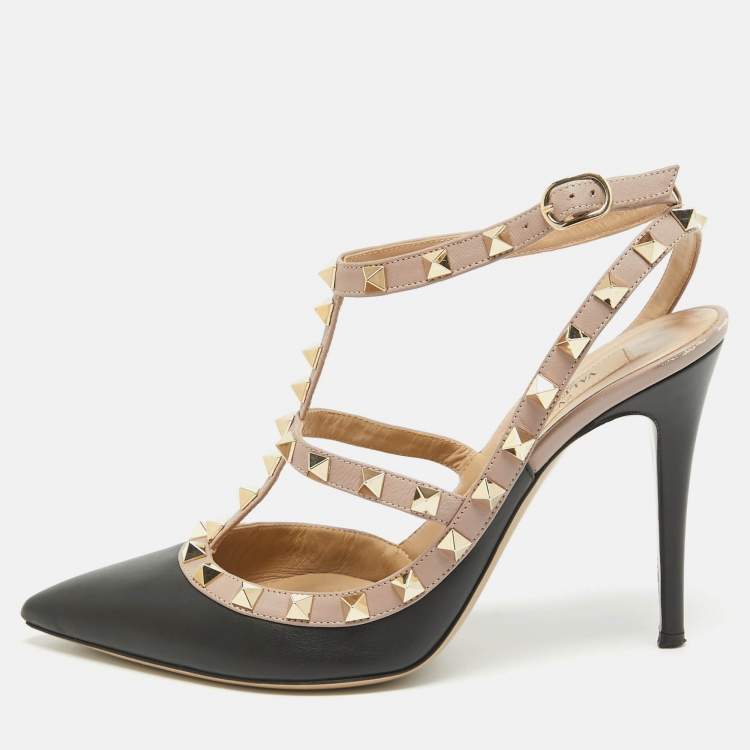 Valentino Black/Dusty Pink Leather Rockstud Ankle Strap Pumps Size 38.5