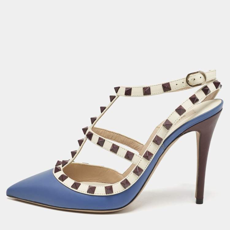 Valentino Blue/White Leather Rockstud Caged Ankle Strap Pumps Size 39