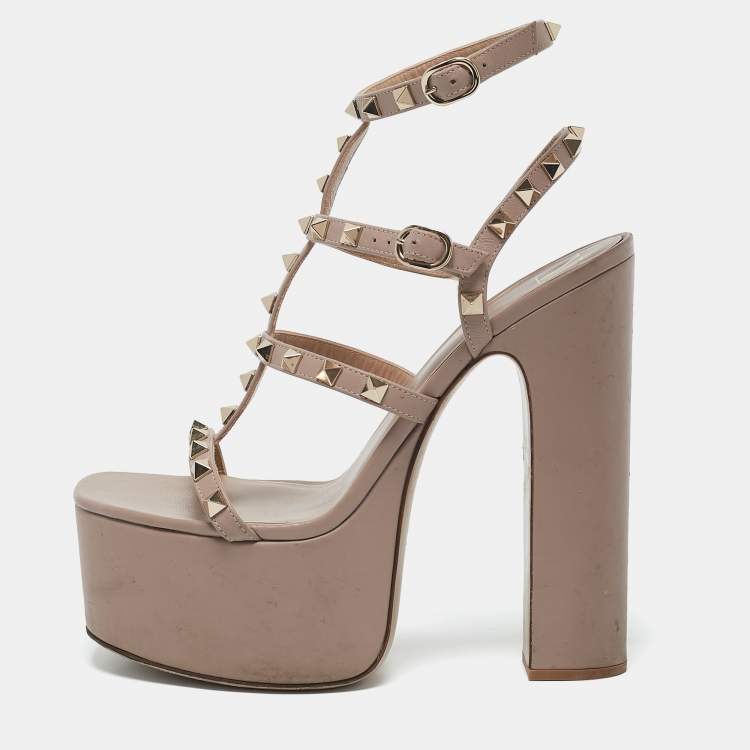 Pre Owned Valentino Dusty Pink Leather Rockstud Ankle Strap Block Heel Platform Sandals Size 39