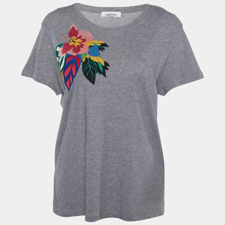 Valentino Grey Cotton Knit Floral Patch Detail T-Shirt XL