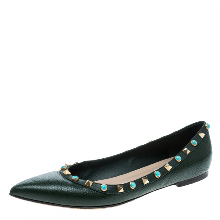 Valentino Myrtle Green Leather Rolling Rockstud Pointed Toe Ballet Flats Size 38.5