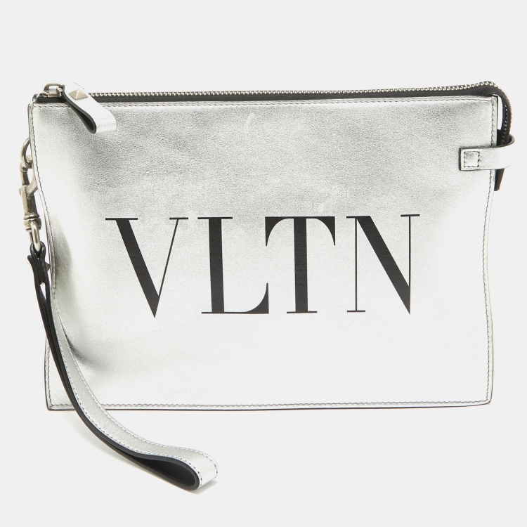 Pre Owned Valentino Silver Leather VLTN Wristlet Clutch