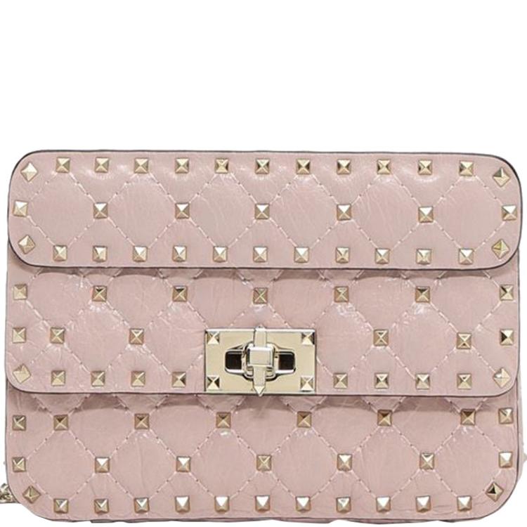 Pre Owned Valentino Water Rose Quilted Soft Crackle Leather Small Rockstud Spike Chain Shoulder Bag