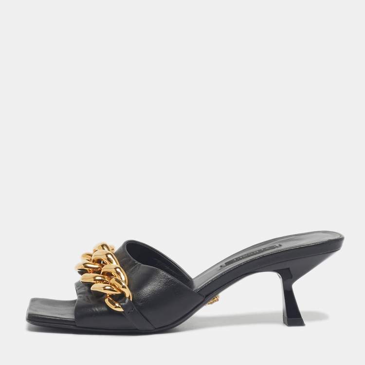 Pre Owned Versace Black Leather Medusa Chain Link Slide Sandals Size 36