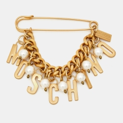 Moschino Logo Faux Pearl Gold Tone Brooch