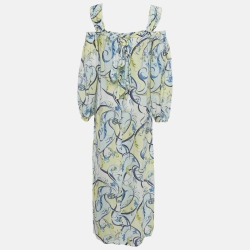 Emillio Pucci Blue and Yellow Printed Cotton Silk Cold Shoulder Sheer Maxi Dress M
