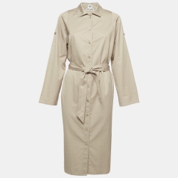 Hermès Beige Logo Embroidered Cotton Belted Midi Shirt Dress M