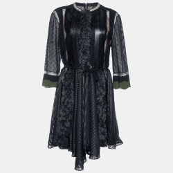 Louis Vuitton Black Textured & Leather Sequin Detail Asymmetric Hem Midi Dress M