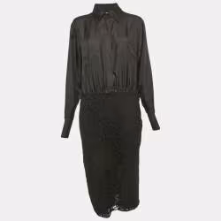 Valentino Black Lace and Satin Long Sleeve Midi Dress L