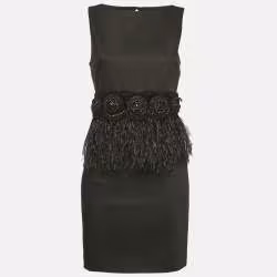 Alice + Olivia Black Feather Trim Crepe Marigay Rosette Peplum Dress S