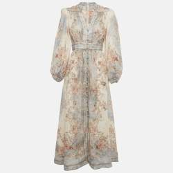 Zimmermann Beige /Blue Printed Linen Plunge August Midi Dress M