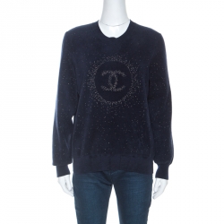 Chanel Navy Blue CC Quilted Pattern Wool High Neck Sweater S