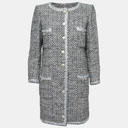Chanel Grey Checkered Tweed Chain Embellished Buttoned Dress Coat XL