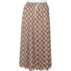 Gucci Brown GG Print Cotton Knit Drawstring Pleated Midi Skirt S