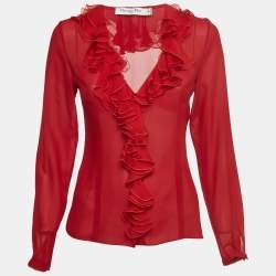 Christian Dior White Beaded Tulle Ruffle Detail Blouse S