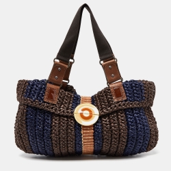 Marni Brown/Blue Woven Straw and Leather Round Lock Tote