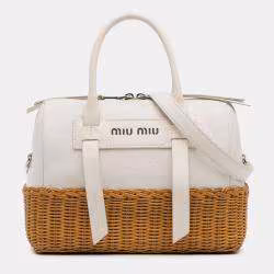 Miu Miu Brown White Wicker Trimmed Leather Top Handle Bag