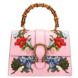 Gucci Pink Calf Leather Medium Bamboo Dionysus Embroidered Top Handle Bag