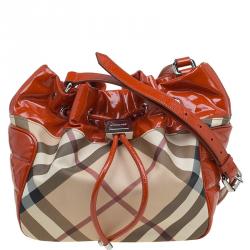 Burberry Red Orange Nova Check Patent Leather Drawstring Hobo