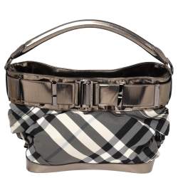 Burberry Metallic Grey/Beige Nova Check Coated Canvas And Patent Leather Small Warrior Hobo