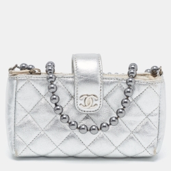 Chanel Grey Quilted Satin Leo Lion CC Pearl Clutch