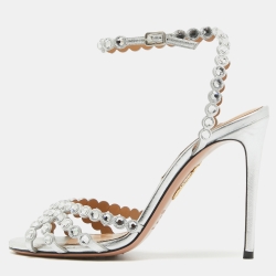 Aquazzura Silver Leather Crystal Embellished Ankle Wrap Sandals Size 37