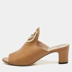 Fendi Beige Leather F Logo Open Toe Mules Size 37.5